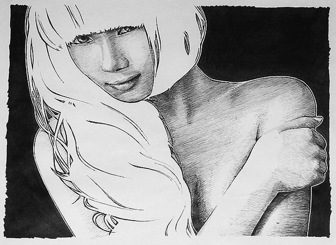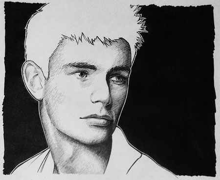 ......The subject(s) are drawn with linear hatched lines in ink. Clothes and hair are simplified with only an outline and large negative spaces can be filled in solid with black marker. This process renders the most human elements in great detail while lessening any distracting values to attract more attention to the subject in an illustrative style.
